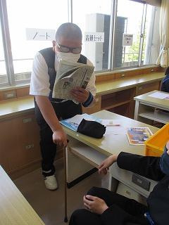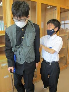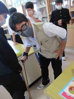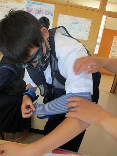2年生の家庭科では「私たちの住生活」について学習しています。家族の住まいを安全・安心にするために、どんなことに留意すればよいか、高齢になるとどんな点に不安を感じるかを実体験し、今後の学習に活かしていきます。