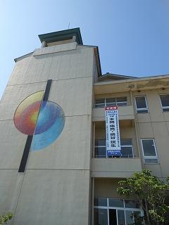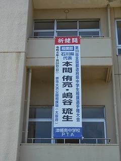 ▽校舎には、全国都道府県中学生相撲選手権大会に出場する生徒の健闘を祈る懸垂幕が飾られました。