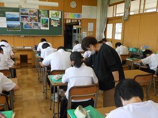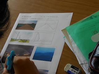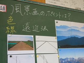 2年生美術の夏休みの宿題は「風景画」です。宿題にじっくり取り組むために、風景画のポイントを確認していました。中村先生のプリントをもとに、線や色で遠近を表現する技法を学びました。