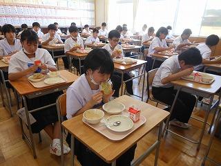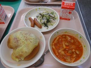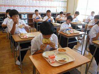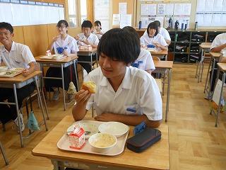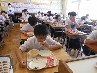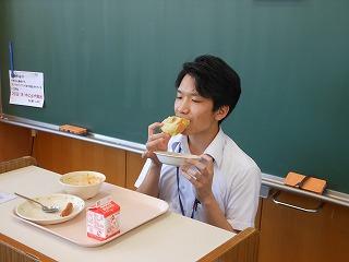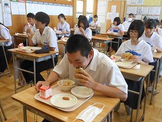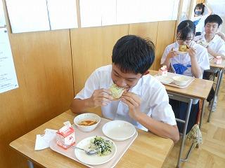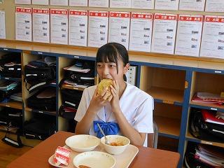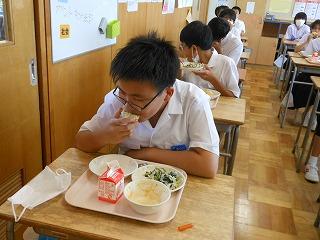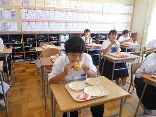 今日の給食メニューは生徒たちに人気の手作りメロンパン。メロンパンとあらびきウィンナー、金時草のマリネ、ミネストローネをおいしくいただきました。給食時の教室を訪問してみると、みんなおいしそうにメロンパンをパクリ。今日も暑い1日ですが、元気が出るメニューでしたね。