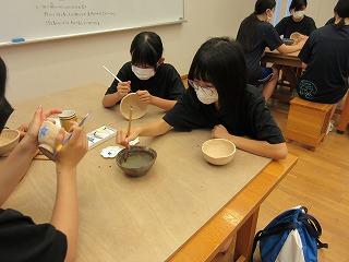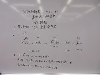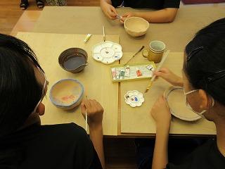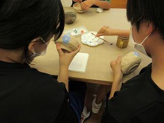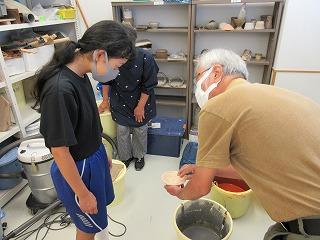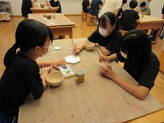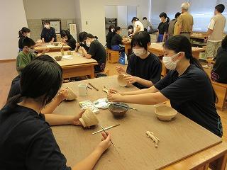 美術部の皆さんは夏休み期間中の活動として、シグナスでの陶芸教室に参加しています。10日は地域の皆様のご指導を受け、釉掛けを行いました。いよいよ本焼、17日(今日)の窯出しが楽しみですね。