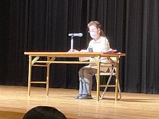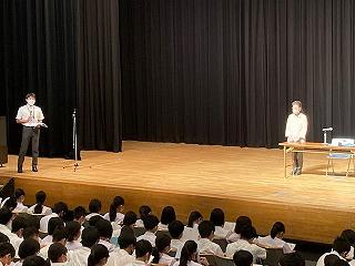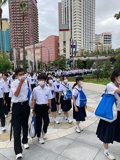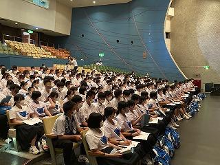 バスで広島市青少年センターに移動し、平和講話に臨みました。