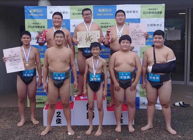 本日、石川県立武道館屋内相撲場において、石川県相撲選手権大会が開催され、中学校の部で本校相撲部が9年ぶり3回目の優勝を勝ち取りました。個人戦でも3年生の本閒くんが3位に入賞しました。