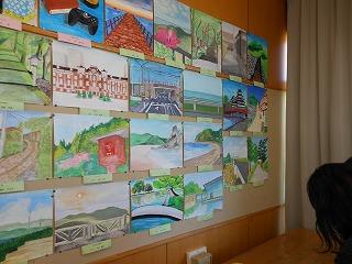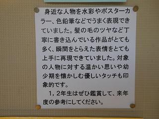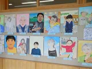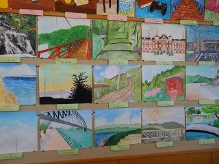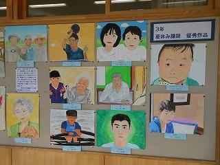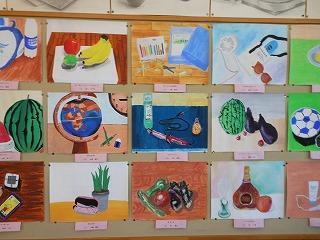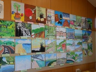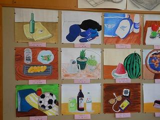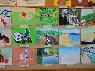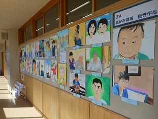 先日、郡市の美術作品展・町の美術作品展に出品された生徒のお知らせをしましたが、惜しくも代表にはならなかったものの、全校生徒にとって今後の制作の参考となる美術作品が美術室前の廊下や美術室後ろの掲示板に貼られています。