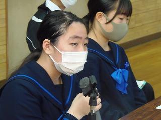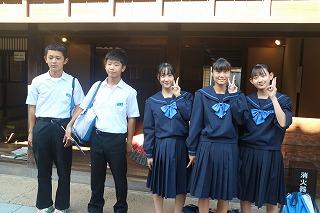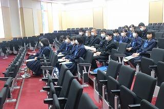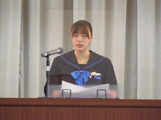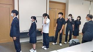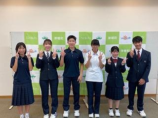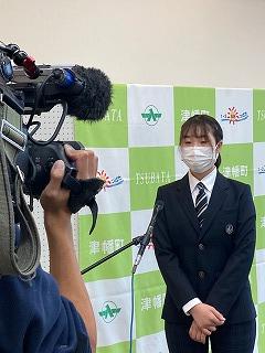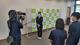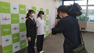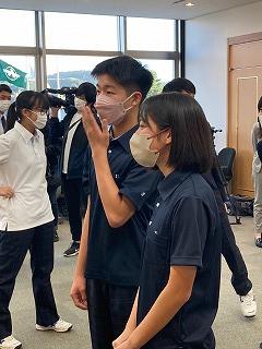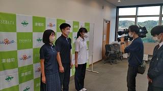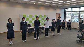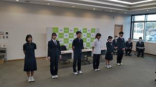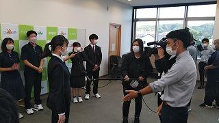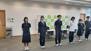 今日午後4時から、11日付の通知でご案内した新制服のプレスリリースが町役場2F庁議室で行われました。吉田津幡町教育長様の説明に続いて、本校と津幡中の生徒計6人が登場し、インタビューを受けていました。