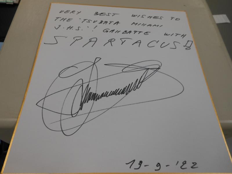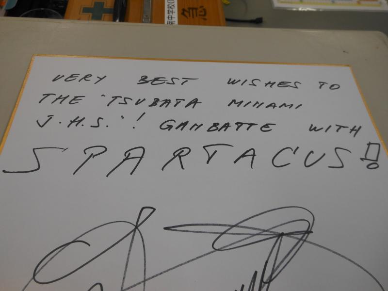 昨日、本校吹奏楽部に大阪から封筒が届きました。中を開いてみると、オランダ人作曲家のヤン・バン・デル・ローストさんからの激励色紙が同封されていました。よく見ますと、「つばたみなみ」「がんばって」とメッセージも添えられたサイン色紙です。本校吹奏楽部は10月10日に金沢桜丘高校吹奏楽部演奏会にゲスト出演し、22日に第70回全日本吹奏楽コンクールに参加します。今日・明日はテスト前ですが、短時間の活動に取り組み、本番を迎えます。自由曲作曲者からのサプライズプレゼントです。
