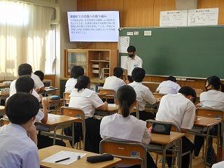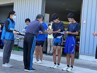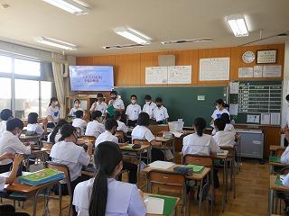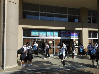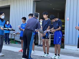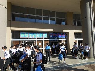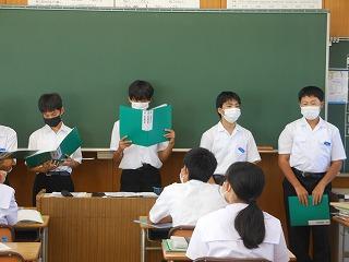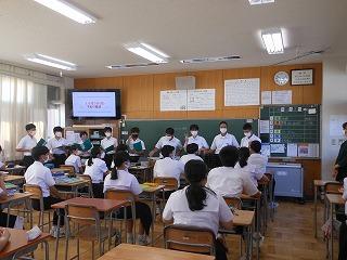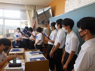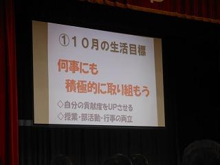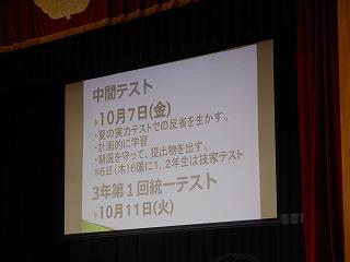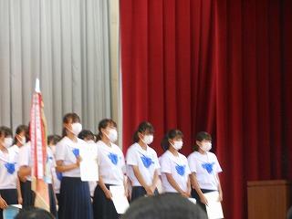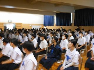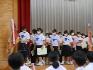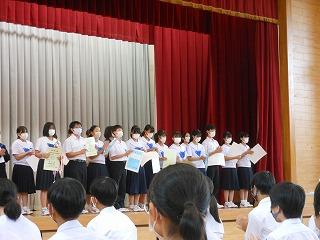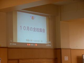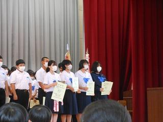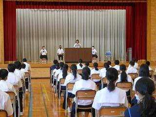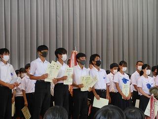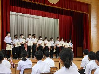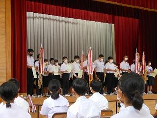 昨日の6限目に10月の全校集会を行いました。2・3年生は体育館で、1年生は卓球場リモート形式と2ヶ所に分かれて実施しました。優勝旗7本や全中新人ボートの入賞、美術部の作品展など表彰披露では180人の名前が呼ばれ、ステージ上の生徒が5列になりました。