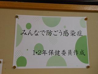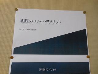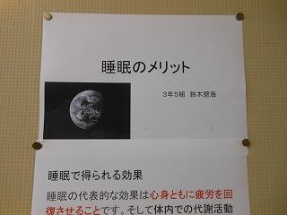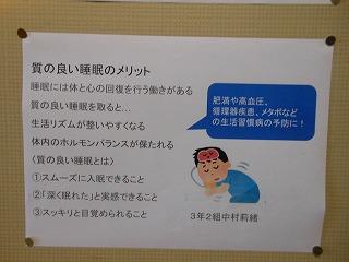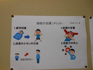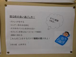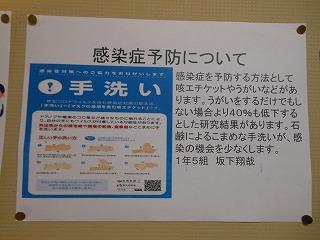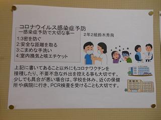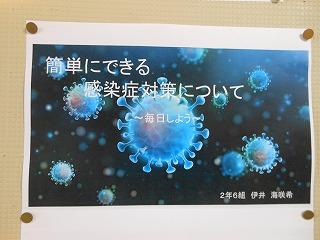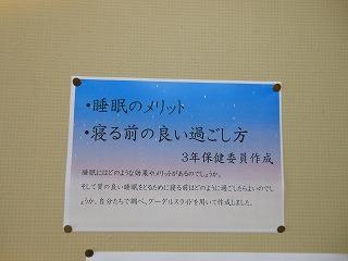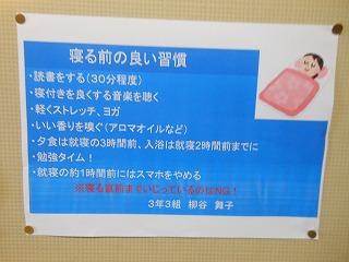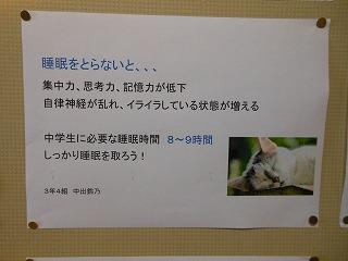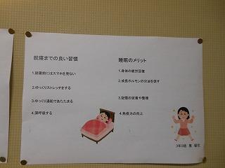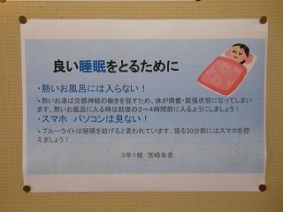 後期保健委員会では、全校生徒に「睡眠の大切さ」と「感染症予防対策の継続」についてポスターを作成しました。人間の生活リズムにとって睡眠をとることは重要です。保健室前を通った時には委員の皆さんの呼びかけに目を通してください。