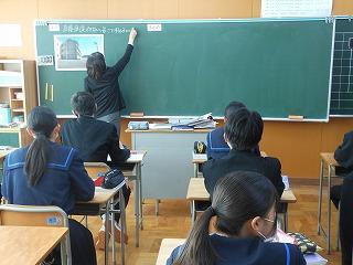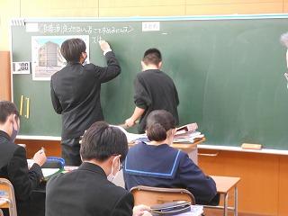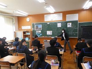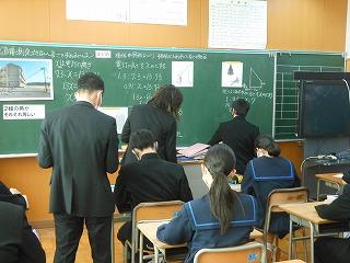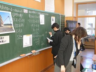 昨日の6限に数学科の研究授業(3年1組標準コース・吉村先生)を行い、授業後には石川県教育委員会の先生とともに授業整理会を行いました。「相似な図形」の単元で「直接測定できない長さを求めるにはどうすればよいか」を課題に、まずは自分で考え、その考えを全体に広げて解決にいたりました。発表にあたっては話し方名人・聞き方名人を意識している姿が印象的でした。授業の終末には、学習したことを使って適用問題に取り組みました。