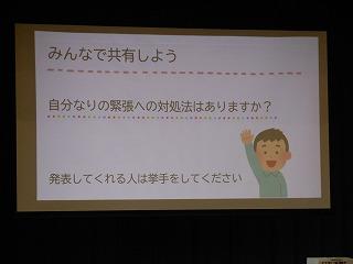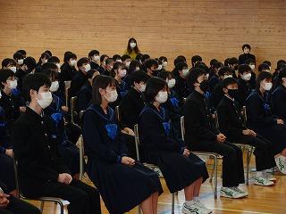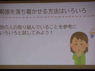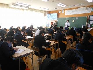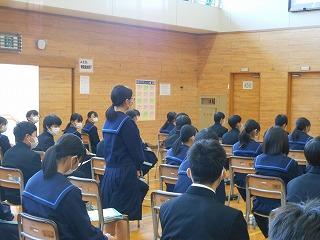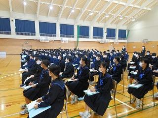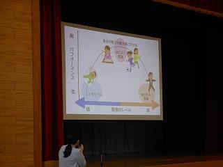 先週の1年生に続いて、今日は2・3年生が学年ごとに西本スクールカウンセラーさんのお話を聞きました。テーマは「緊張を味方につける」です。様々な場面で緊張してしまうことがありますが、どうやって、ほど良い緊張感を味方につけ、自分の持っている力を発揮できるかについて、具体的な対処法を学ぶことができました。