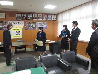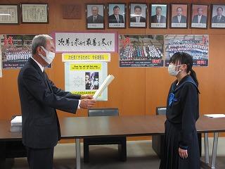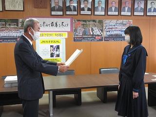 今日午後1時に、金沢間税会の皆様が来校され、税の標語で入賞した2名の生徒に表彰状を授与いただきました。全国で50万点を超える応募の中から入賞した2名です。おめでとうございます。