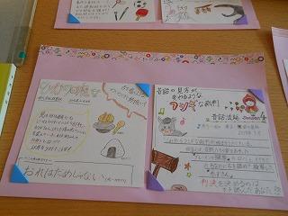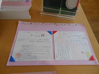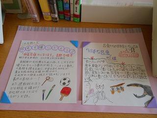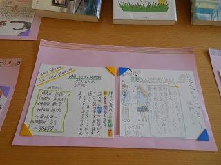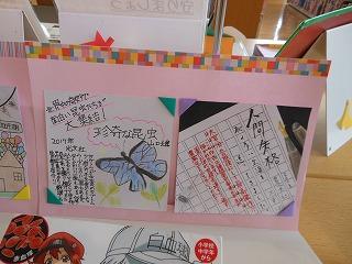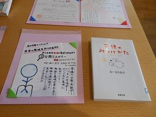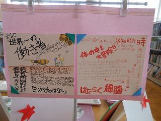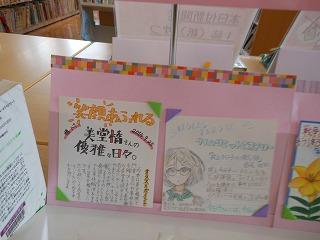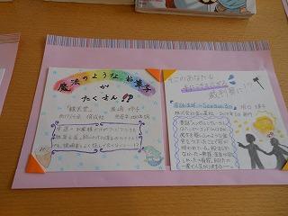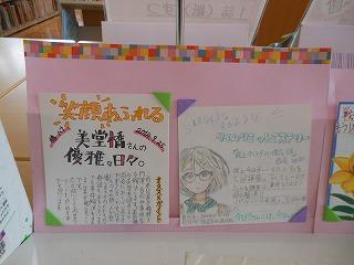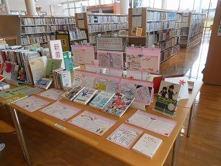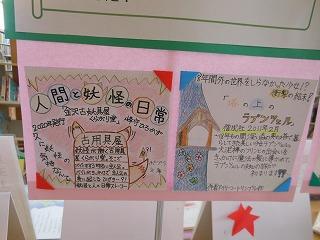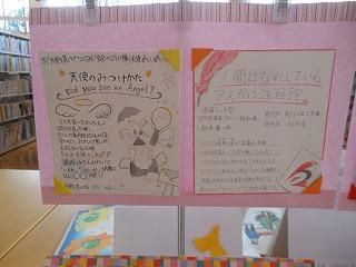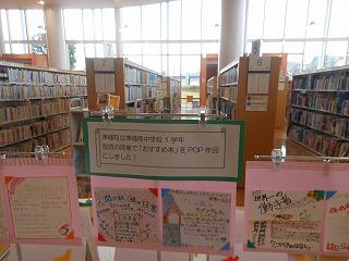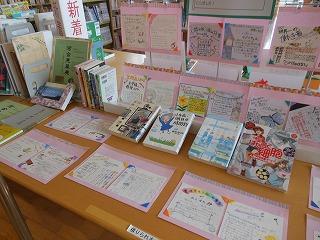 本校1年生が国語の授業で作ったおすすめ本の紹介文(POP)が町立図書館に展示されています。今月末まで23名の作品が貸し出しカウンター前に本とともに飾られています。
