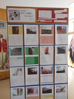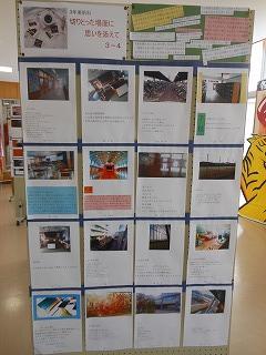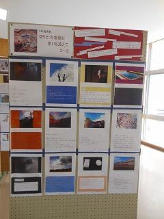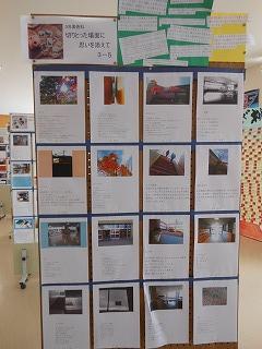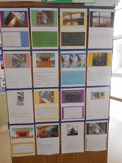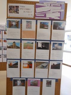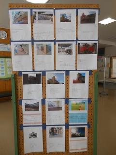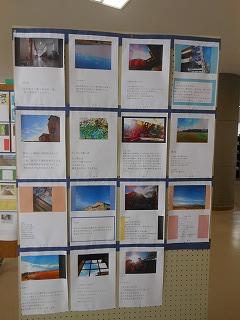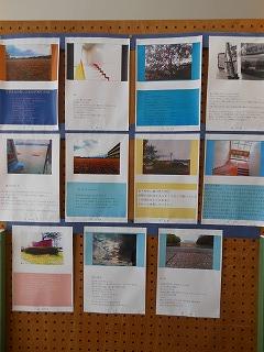 展示ホールには、3年生が美術の時間に制作した「切りとった場面に思いを添えて」掲示物が貼られています。卒業まで3ヶ月となり、改めて校内を歩きながら、思い出に残るワンショットとその一コマに込めた思いをつづっています。アングルも工夫され、中学生らしい感性が感じられます。保護者の皆様もぜひご覧ください。