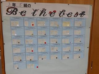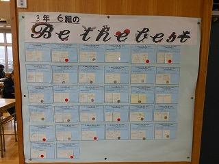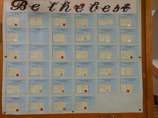 生徒会目標「Be the best~なりたい自分になるために~」の各自の学期ごとの取組を学級ごとに振り返りました。1学期の反省を受けて、2学期初めに設定した取組がどれくらい達成できたでしょうか。金・銀・赤の3色のシールで振り返りましたが、若干、赤が多いようです。ぜひ3学期の振り返りは金・銀が増えるといいですね。