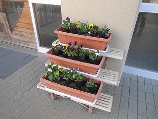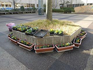 図書室に続いて、学校前のプランタも冬に模様替え。ヒャクニチソウからパンジーに変わりました。校務員の穴太さんが植え替えをしてくださいました。生徒達の登下校を見守る玄関の花々です。