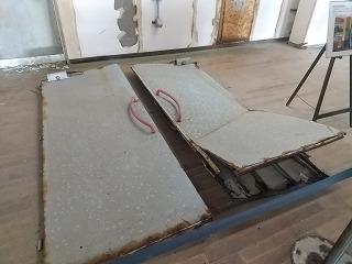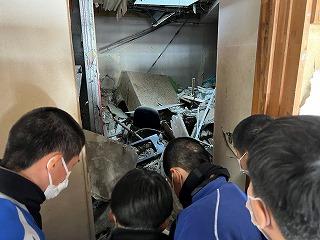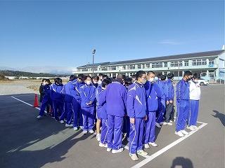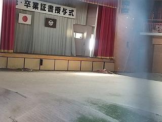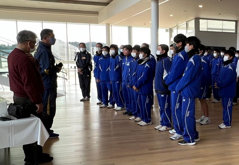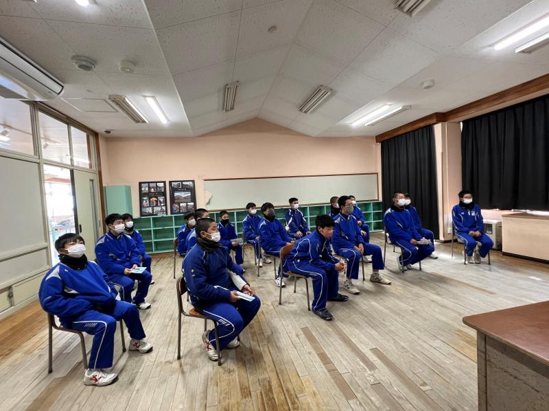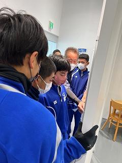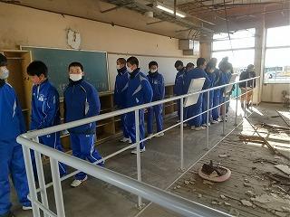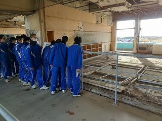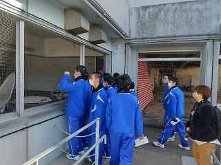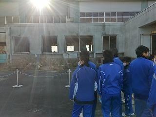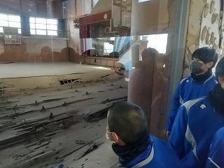 30分の訪問の予定を大幅に上回り、部員たちは卒業式の準備がされたまま被害にあった体育館の様子などを見学してきました。