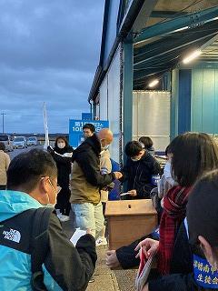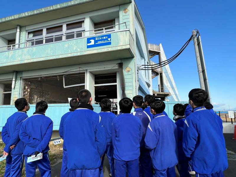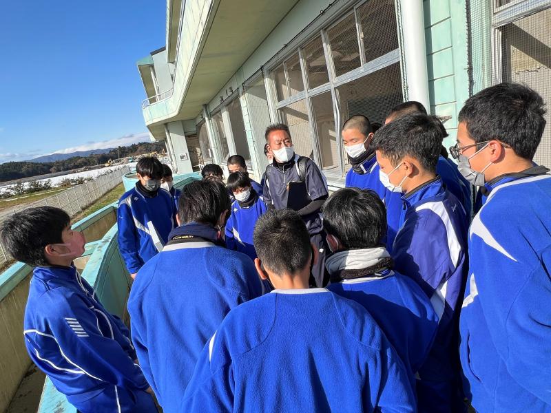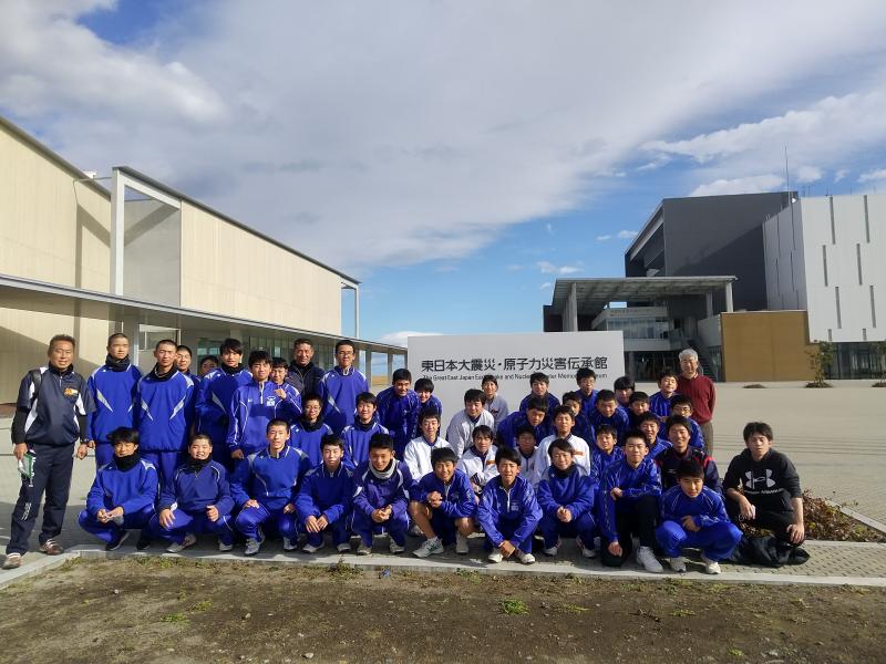 福島県の浜通りに移動した野球部員。本校と金沢市立長田中のメンバーで現地の先生方引率のもと、諸戸小学校と原子力災害伝承館で学びを深めました。