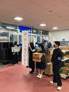 今日から3日間にわたって、朝の登校時に生徒会による赤い羽根共同募金を行っています。執行部の4名が2グループに分かれて呼びかけしています。今日と明日の放課後は町内のプラント3でも募金活動を行います。