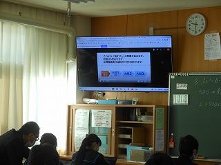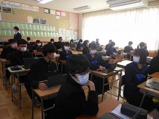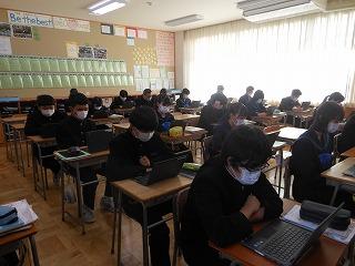 昨日の町学力実態調査に臨んだ2年生。今日は英語の話すことテストに取り組みました。設問を聞き、Chromebookの画面に向かって解答していました。