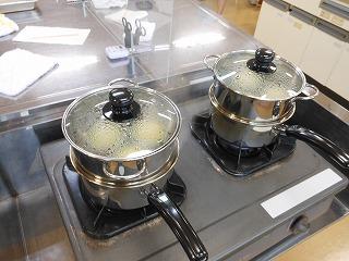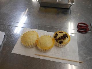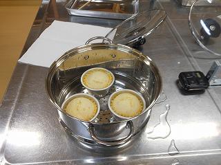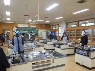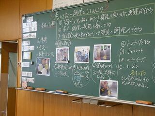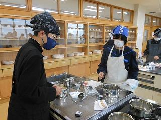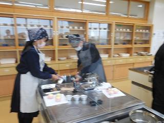 1年生は技術から家庭に切り替わって1ヶ月あまり。食に関する基本的な学習に続き、いよいよ調理実習が始まりました。挑戦するのは「蒸しパン」。プレーンのほかに、チョコチップやチーズなど、一人3種類の蒸しパン作りに取り組みました。クラスを前半後半に分け、大きなパーテーションを間にはさみ、一人調理で行っています。