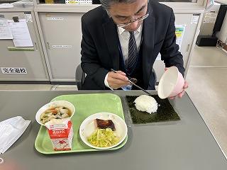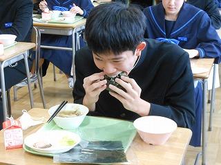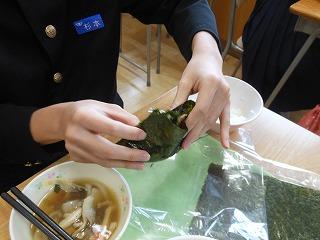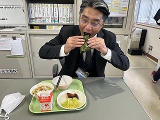 初日の昨日は学校給食の始まりのメニューの再現です。セルフおにぎり・鮭の塩焼き・漬物・芋煮汁で、永井校長先生の給食の様子を掲示物にし、各学級で参考にしながら、おにぎりを作り、いただきました。