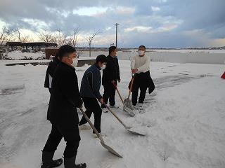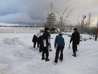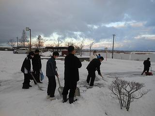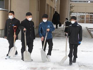 気温は低かったものの、大雪にはならず、本日を迎えました。学校前も数センチ程度の雪でしたが、登校した相撲部やボート部の部員が除雪活動に協力してくれました。