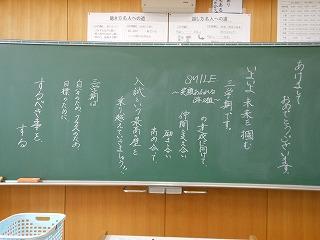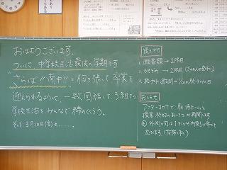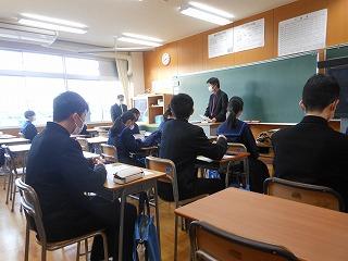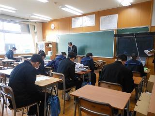 明日からの3連休、いよいよ私立高校推薦入試が始まります。今日は推薦入試を受験する生徒が登校し、学年主任の吉田先生から激励の言葉を受けました。全体指導では菊田先生の諸注意を確認し、学級担任の先生と持ち物などを確認して下校しました。3年生204人の先陣を切って、良いスタートを迎えてください。