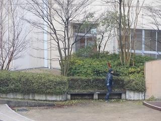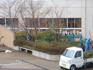 ▽中庭や体育館前の傷んだ木の伐採や生け垣の整備をしていただきました。(7日)