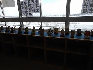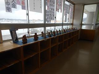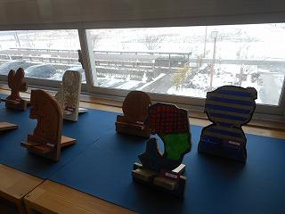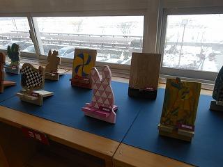 3年生が美術の時間に制作していた「スマホスタンド」がクラスごとに完成し、職員室前に展示されています。デザインから工夫を凝らした名作品が並んでいます。