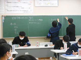 3年生の英語科では教科書の学習内容が終わり、これまでの復習プリントに取り組むことが多いのですが、ALTのクロエ先生が来られる時にはペアワークやグループ学習をしています。2組の英語では既習の熟語を使って、3~4人で文章を考える活動を行っていました。