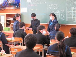 今日の給食の時間に、3年生の各クラス代表が運動会で同じ団だった1・2年生のクラスにメッセージを届けました。卒業を来週に控え、先輩として、1・2年生に伝えたいメッセージを一人ひとりがまとめました。