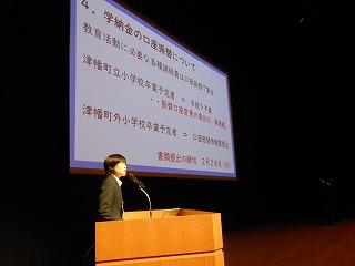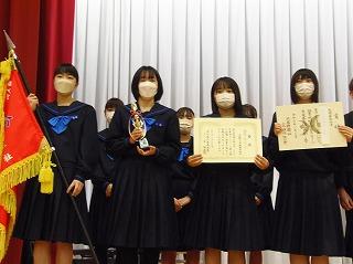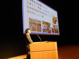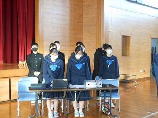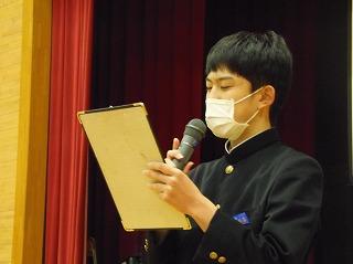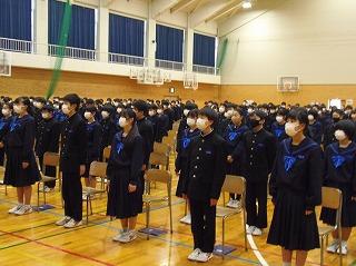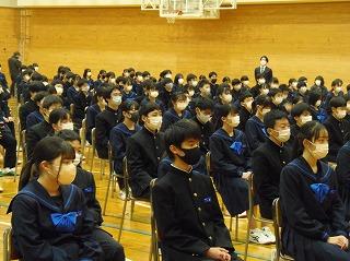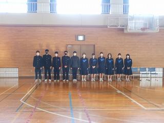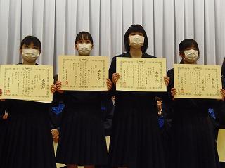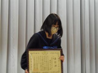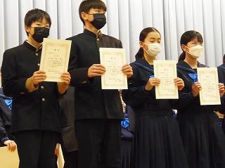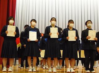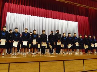 まずは表彰披露です。吹奏楽部の新人戦やボート部のインドアローイング大会、津幡町英語スピーチコンテスト、人権作文などの表彰生徒がステージに上がりました。