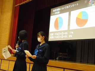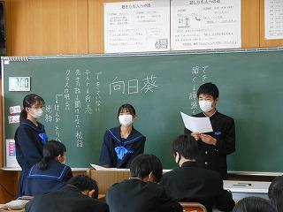 最後に生徒会タイムです。重点委員会の美化委員会から無言清掃の徹底について呼びかけがありました。また、選挙管理委員会より令和5年度前期生徒会役員選挙の公示されました。執行部からは水越さんが生徒会組織について、杉本くんが後期生徒総会について、全校生徒に説明をしました。