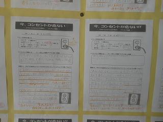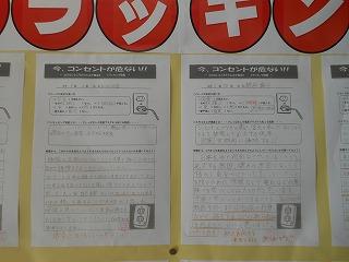 3年生の技術では、学習のまとめとして、トラッキング現象の怖さについて学びました。差しっぱなしの電源プラグから火災が発生した事例を映像で見て、これからの生活で留意することをワークシートにまとめました。生徒たちのワークシートは技術室前の掲示板に掲示されています。1・2年生もどんなことに気をつければいいか考えていきたいですね。