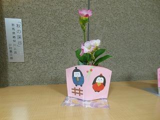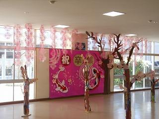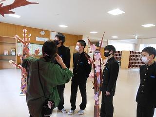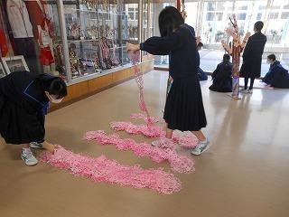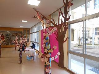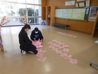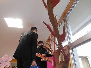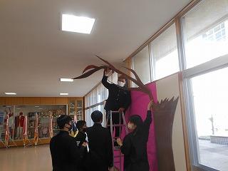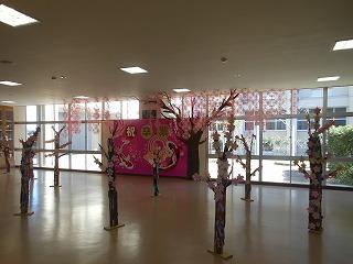 美術部と1・2年生の生徒が美術の時間に合同で制作した「卒業おめでとう」の立体展示が展示ホールに登場しました。満開の桜の木と花形の1・2年生のメッセージが咲き誇る木々が来週金曜日の卒業生の門出を祝っています。