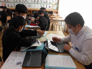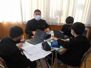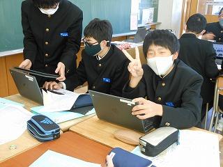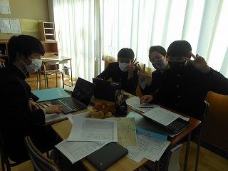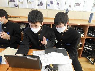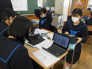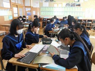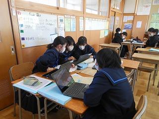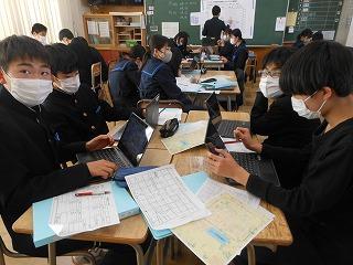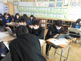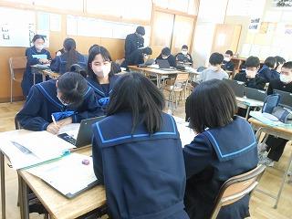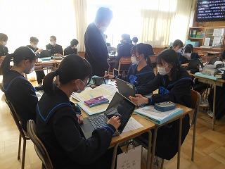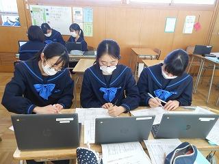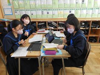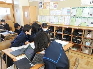 来年度の3年生の修学旅行は5月10日(水)~12日(金)の2泊3日で行います。関西方面で学習しますが、1日目は京都市でタクシープラン研修です。まずは一度プランを立てる練習をしようと、現クラスで仮グループを作り、仮プラン作りに取り組みました。生徒たちはChromebookを使い、名所とともに、昼食をどこで食べようかなどを考えていました。