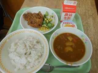 今日の給食は3年生だけ特別メニュー。ジャンボカツ(勝つ)カレーと伊予柑(いい予感)ゼリーでした。