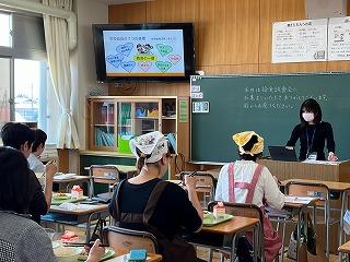 給食調理の動画を視聴したり、給食の大切さについて濱本栄養士の講話を聞いたりして、給食の大切さについて考えていただく機会になったと思います。また、1年生の給食準備の様子も見ていただいたり、また、実際に身支度をして、給食の盛り付け等にも協力していただいたりしました。