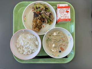 本日の献立は、ごはん・ふくらぎの南蛮漬け・豚肉と太きゅうりの塩炒め・きゃべつのミルクみそ汁・牛乳でした。