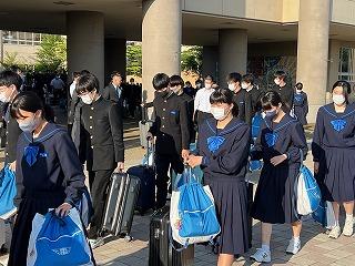 出発式では校長先生から「あいさつ・安全・新しい発見」3つの「あ」を大切にした旅行にしてほしい、というお話がありました。また修学旅行実行委員の久保石さんから「楽しむだけではなく、学びのある旅行にしましょう!」という挨拶がありました。