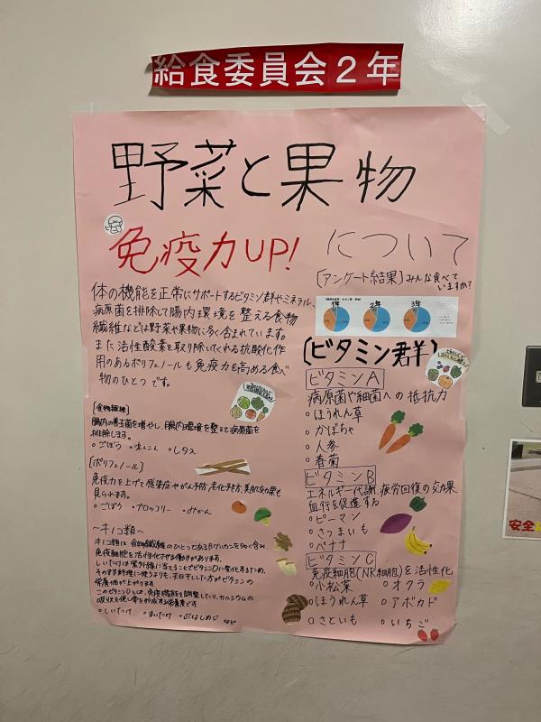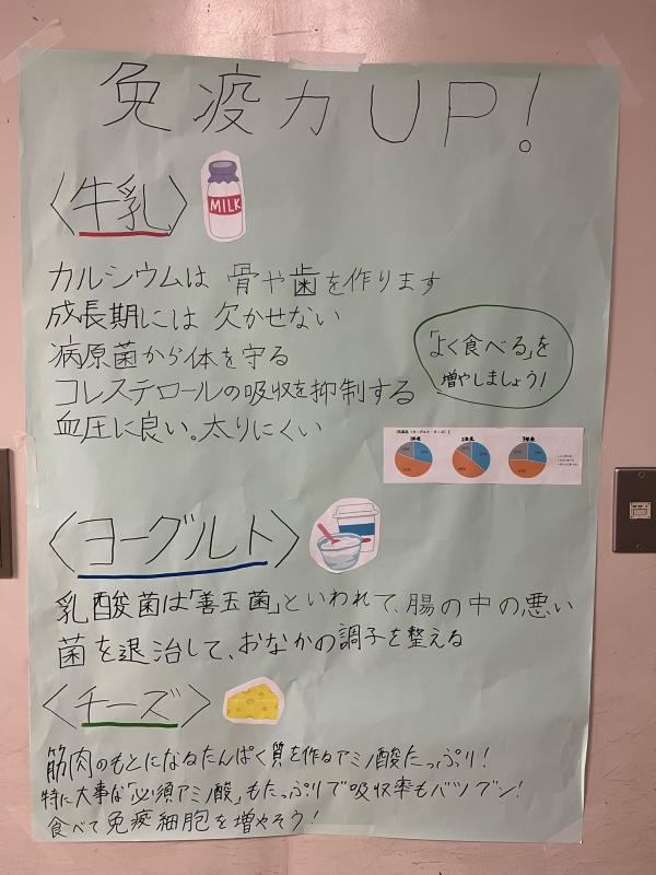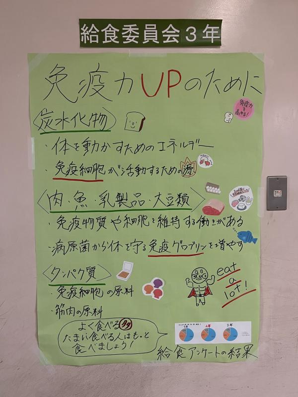 給食委員会が、掲示物を作成し、免疫力をUPさせ、病気に強くなろうと呼びかけています。