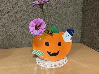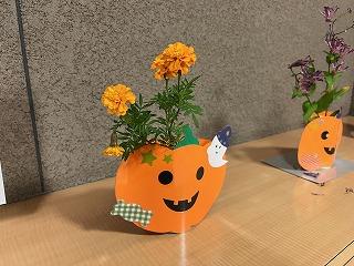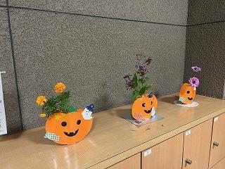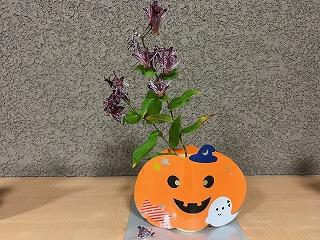 学校に出勤してふと目を下駄箱に移すと、生け花にハロウィンの飾りつけがしてありました。