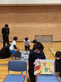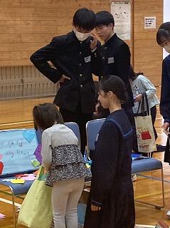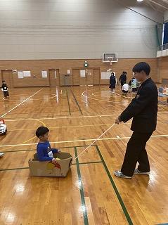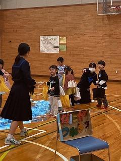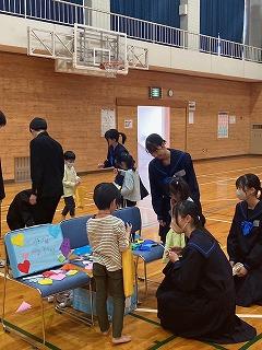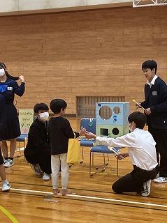 3年5、6組の生徒たちが体験したのですが、家庭科の授業で準備した手作りの遊具を使って、園児たちを存分に楽しませていました。小さい子どもたちと接する機会がない生徒もいるので、とても良い取り組みだと思います。