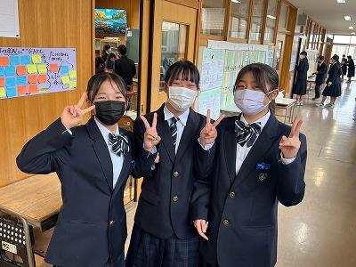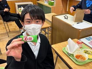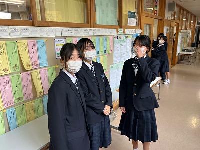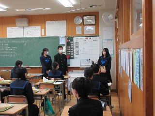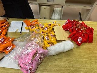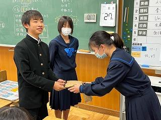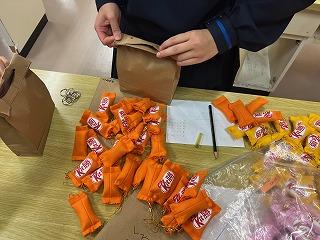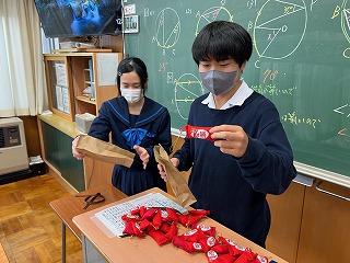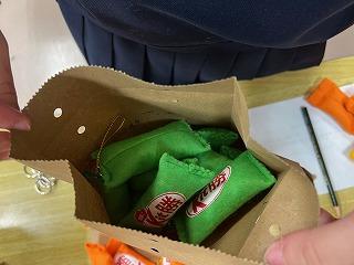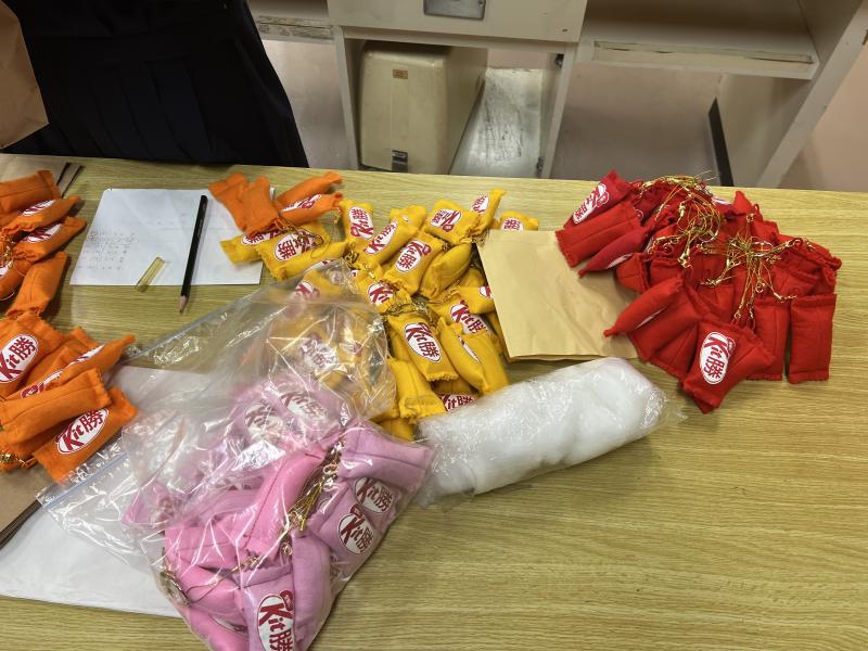 ▽家庭部で3年生へ合格祈願のお守りを作り、手渡しました。