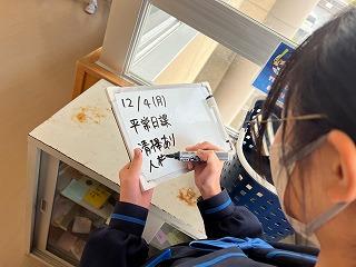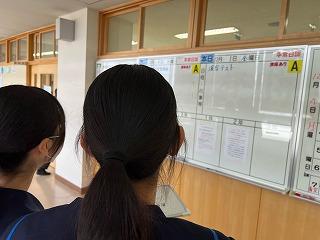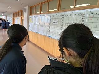 毎日の昼休み、各学級の書記は、職員室前のホワイトボードに翌日の予定を確認に来ます。