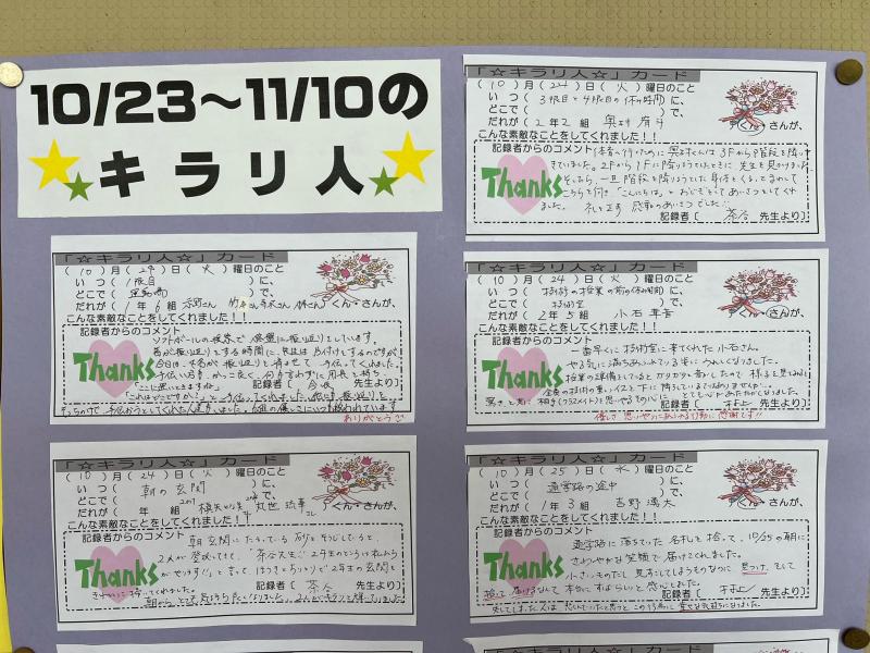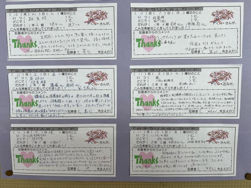 キラリ人とは、学校生活において心づかいが見られる善い行いをした生徒のことで、先生方がその行いに関して感謝を込めてカードを書いています。