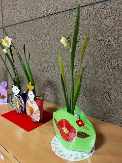 職員玄関には、ひな祭りの花立てが飾られ、来校者を迎えています。
