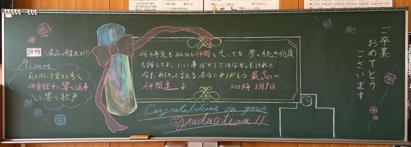 先日行われた卒業式の日、教室の黒板は、美術部の描いた黒板アートで彩られました。