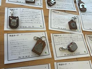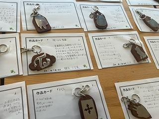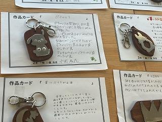 職員室前には、2年生が技術の時間に制作したキーホルダーが飾られています。