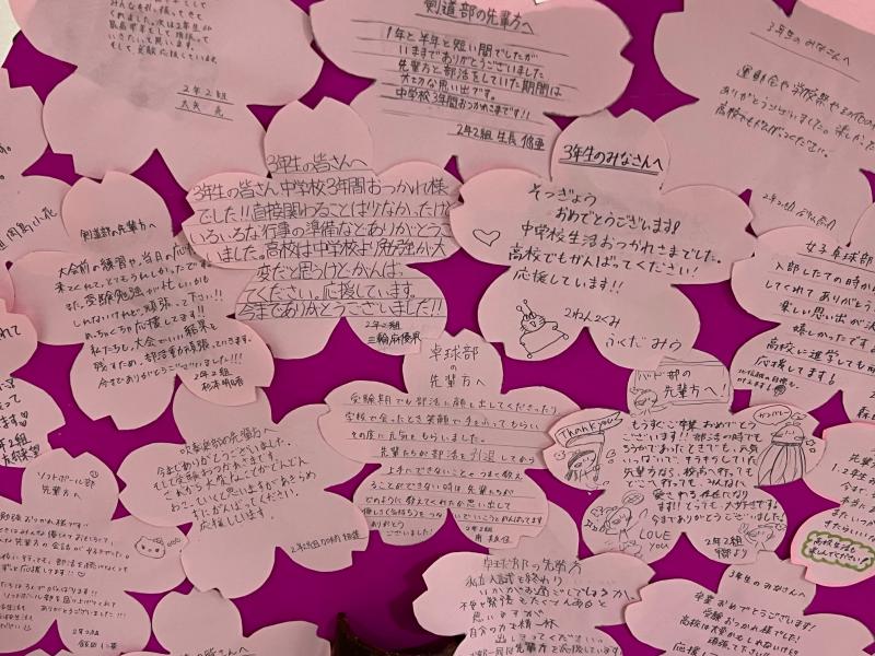 卒業する三年生へ、在校生が桜の花びらにお祝いと感謝のメッセージを書き、それを展示したものです。